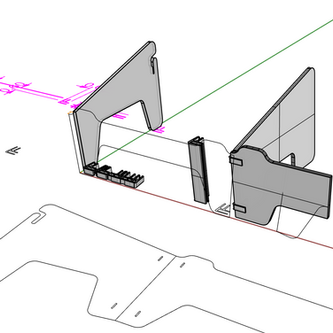 The material used was 14 gauge steel. The digital file (imaged below) was a simple CAD file that allowed for the creation of "bent-tab" connectors during the laser cut process.